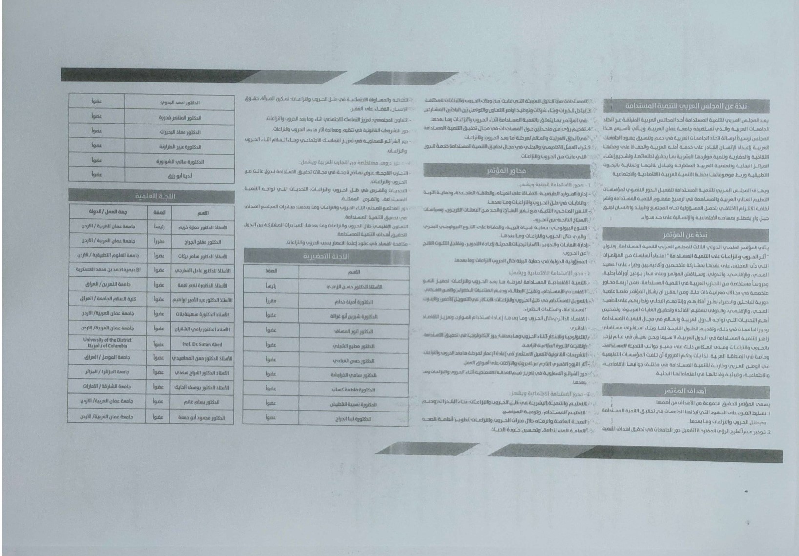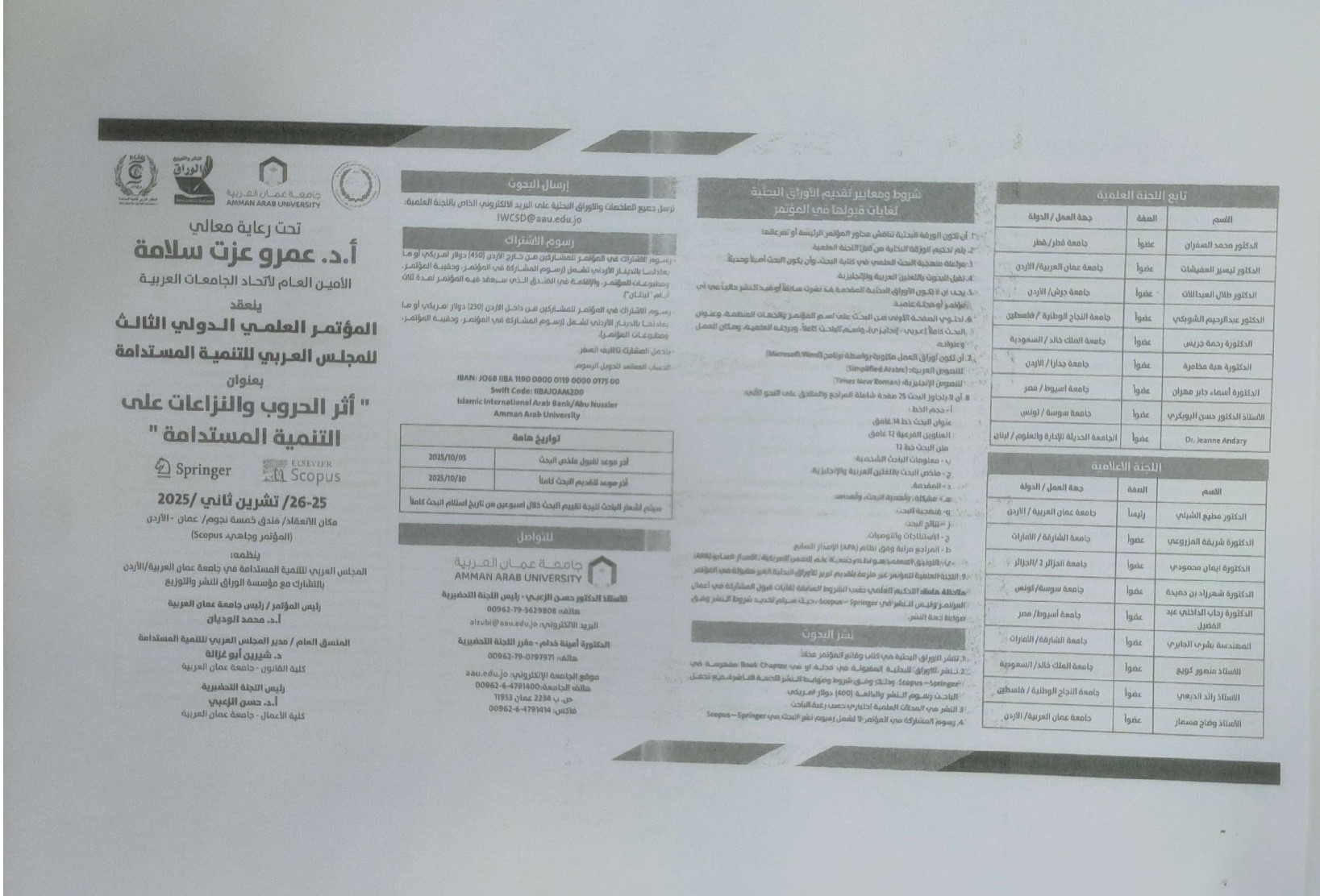 تدعو الأمانة العامة لاتحاد الجامعات العربية الجامعات الأعضاء إلى المشاركة الفعّالة في المؤتمر العلمي الدولي الثالث للمجلس العربي للتنمية المستدامة، والذي يُعقد بالتعاون مع جامعة عمّان العربية خلال الفترة 25-26 نوفمبر 2025 في العاصمة الأردنية عمّان، تحت عنوان: "أثر الحروب والنزاعات على التنمية المستدامة".
