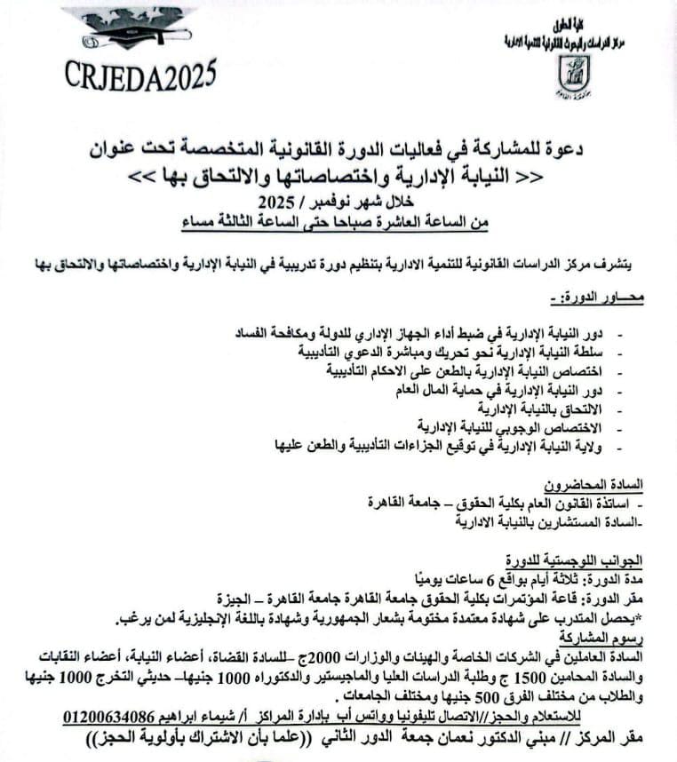 الرئيسية دعوة للمشاركة في فعاليات الدورة القانونية المتخصصة تحت عنوان "النيابة الإدارية واختصاصاتها والالتحاق بها"