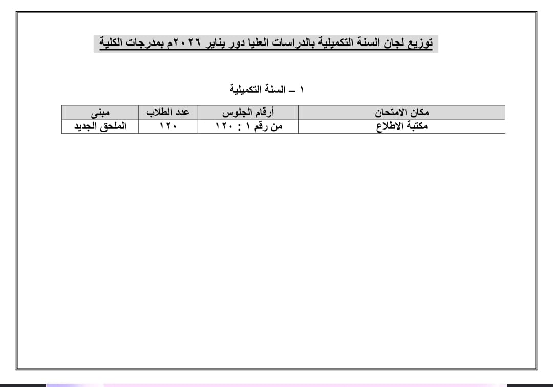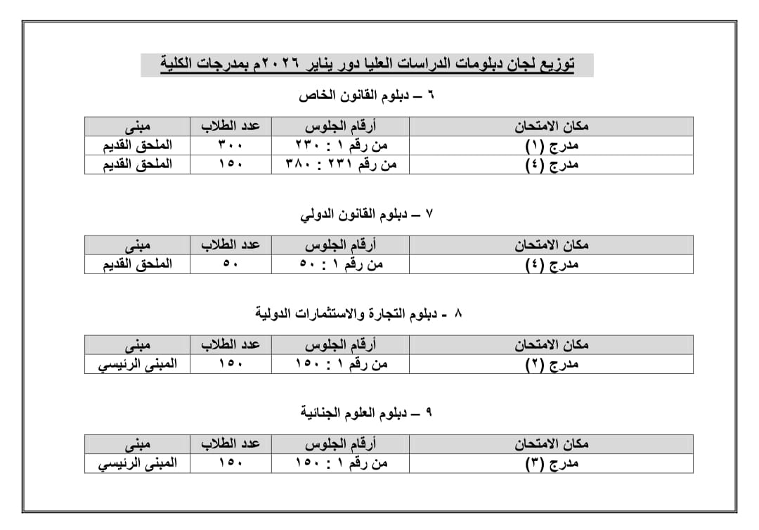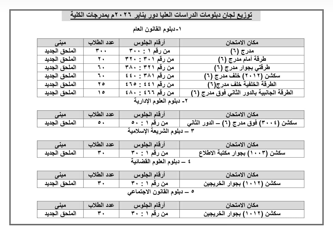 كشف التوزيع الخاص بأماكن امتحان الطلاب المقيدين بقسم الدبلومات والسنة التكميلية بالفصل الدراسي الأول دور يناير 2026م