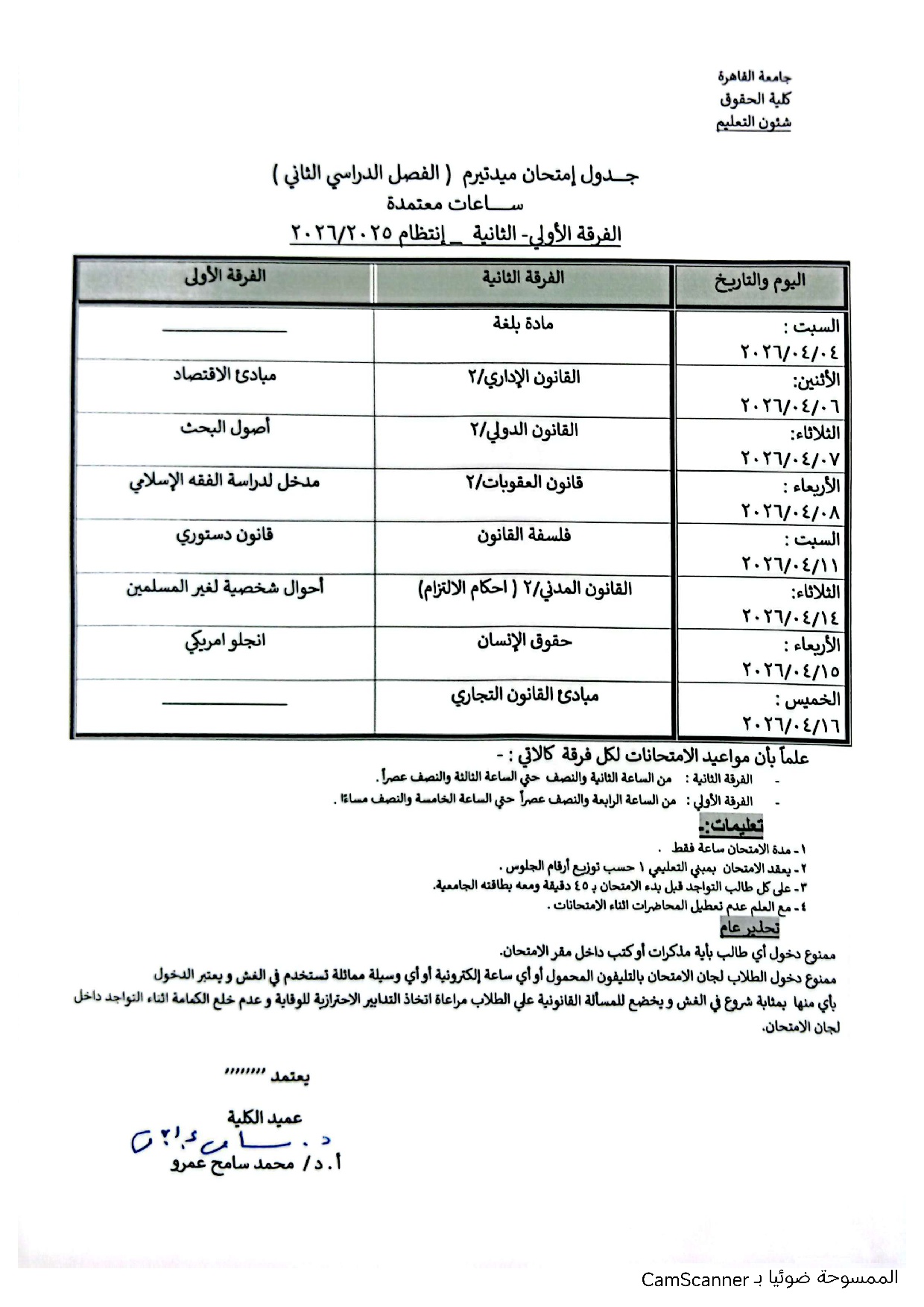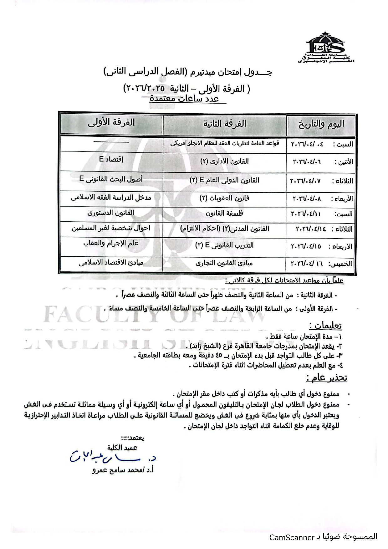 الرئيسية جدول امتحانات الميدتيرم الفصل الدراسي الثاني قسم العربي وقسم الدراسة القانونية باللغة الانجليزية
