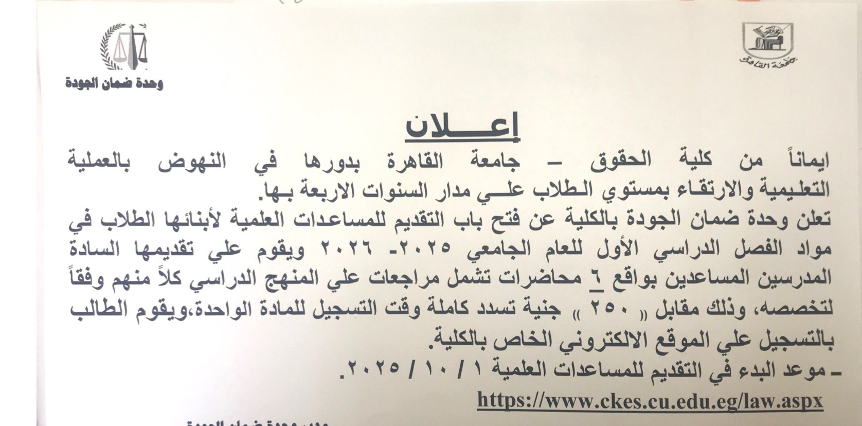 تعلن وحدة ضمان الجودة بالكلية عن فتح باب التقديم للمساعدات العلمية لأبنائها الطلاب في مواد الفصل الدراسي الأول للعام الجامعي 2025-2026 ويقوم على تقديمها السادة المدرسين المساعدين بواقع 6 محاضرات تشمل مراجعات على المنهج الدراسي كلاً منهم وفقاً لتخصصة ، وذلك مقابل 250 جنية تسدد كاملة وقت التسجيل للمادة الواحدة ، ويقوم الطالب بالتسجيل على الموقع الالكتروني الخاص بالكلية