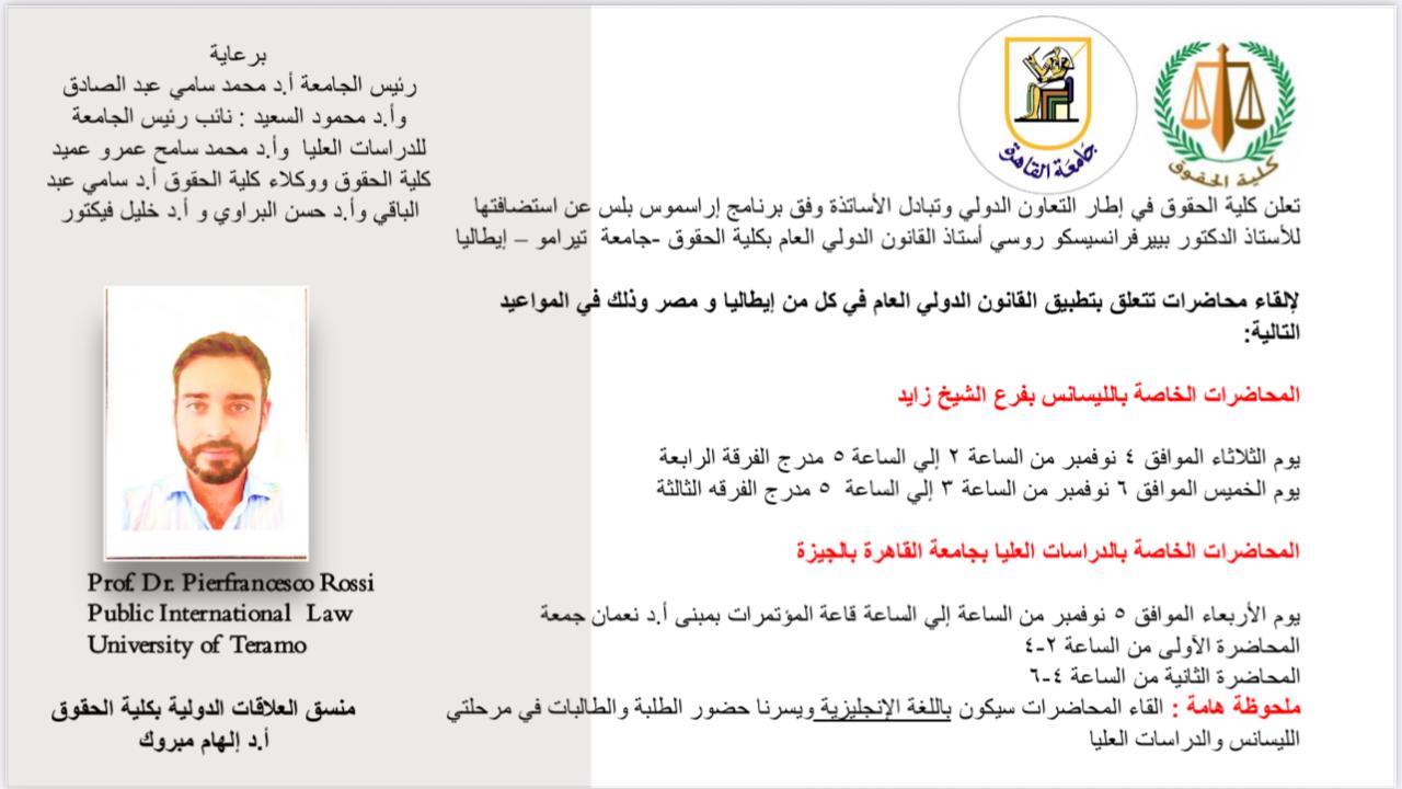 **English text follows below the Arabic ** تعلن كلية الحقوق بجامعة القاهرة، في إطار التعاون الدولي وتبادل الأساتذة وفق برنامج إيراسموس بلس، عن استضافتها للأستاذ الدكتور/ بيير فرانسيسكو روسي، أستاذ القانون الدولي العام بكلية الحقوق بجامعة تيرامو – إيطاليا. سيقوم الأستاذ الضيف بإلقاء محاضرات تتعلق بـ "تطبيق القانون الدولي العام في كل من إيطاليا ومصر". سيتم إلقاء المحاضرات باللغة الإنجليزية، والحضور لطلبة وطالبات مرحلتي الليسانس والدراسات العليا. الت...